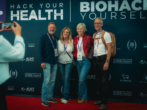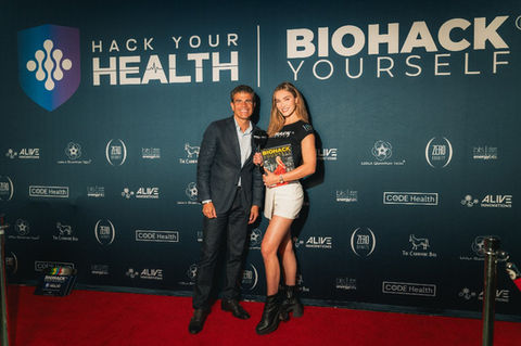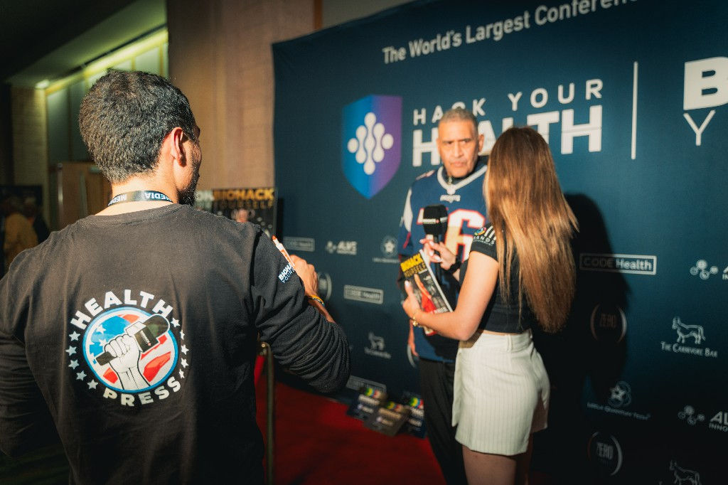 Professional red carpet–style interviews filmed on the official Hack Your Health step-and-repeat backdrop.