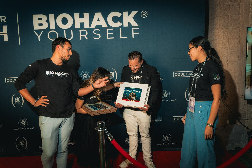 The backdrop, the lighting setup, the interview hosts, the camera team, all provided by Biohack Yourself Media.