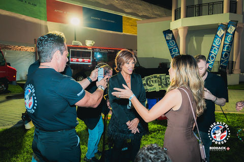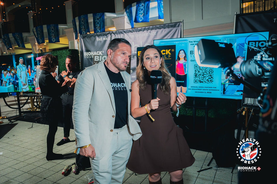 The backdrop, the lighting setup, the interview hosts, the camera team, all provided by Biohack Yourself Media.